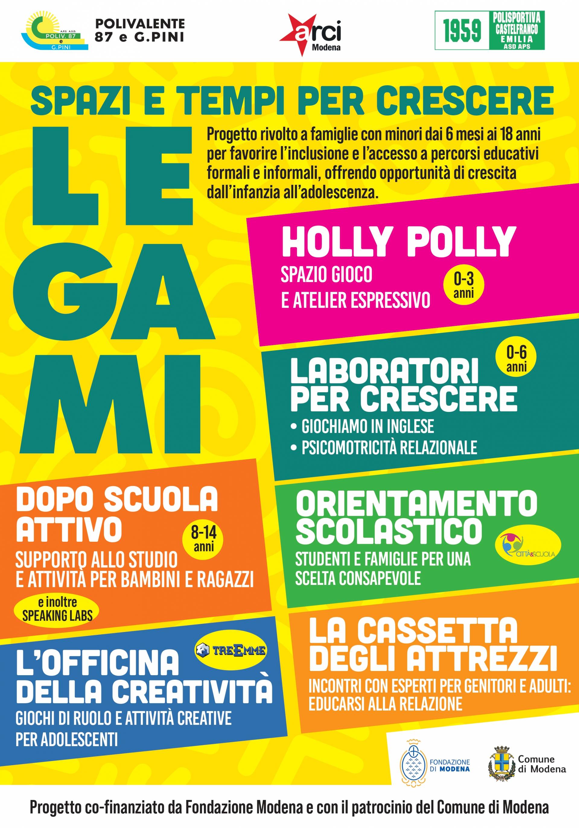 2. “Doposcuola Attivo-liberamente imparo”: presso la Pol87e GPini e polisportiva Castelfranco Emilia, laboratori e compiti assieme divisi in gruppi per fasce d’età (8-16 anni). Un servizio di accompagnamento collettivo che si pone come supporto alle famiglie, punto di aggregazione, socializzazione e di solidarietà interculturale a supporto dei percorsi scolastici ed extrascolastici